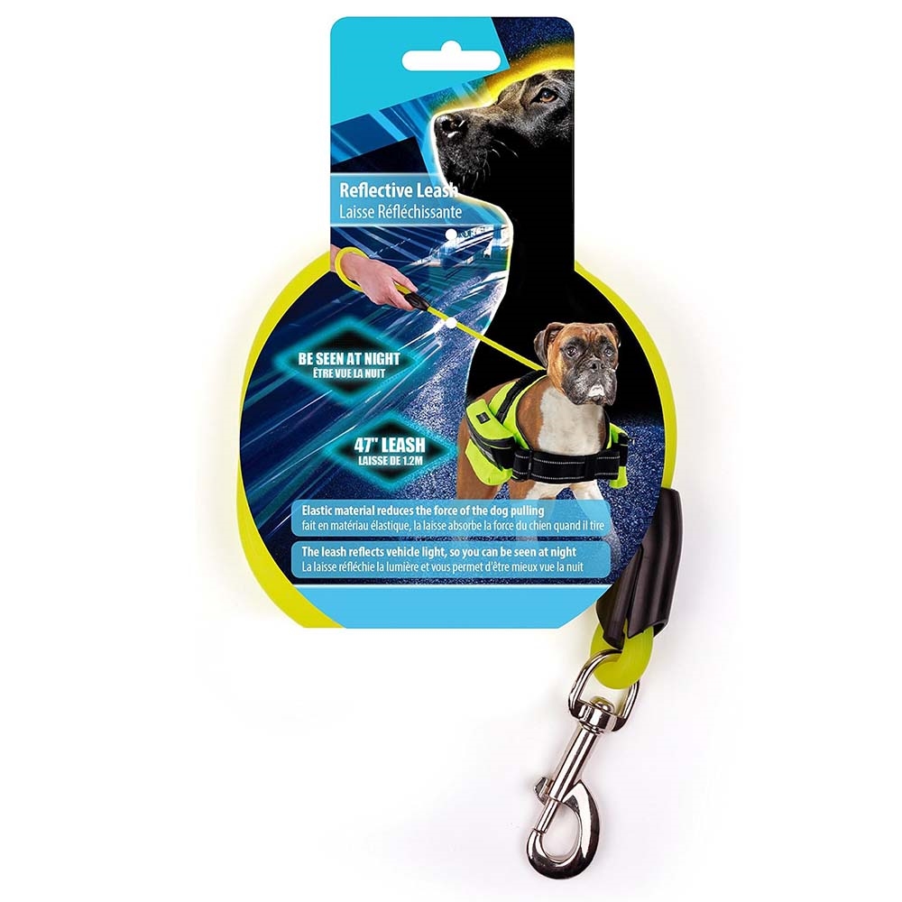 Denna elastiska lina gjord av gummi minskar kraften när hunden drar. Hundkopplet reflekterar billyktor, så din hund kan ses i mörkret.
