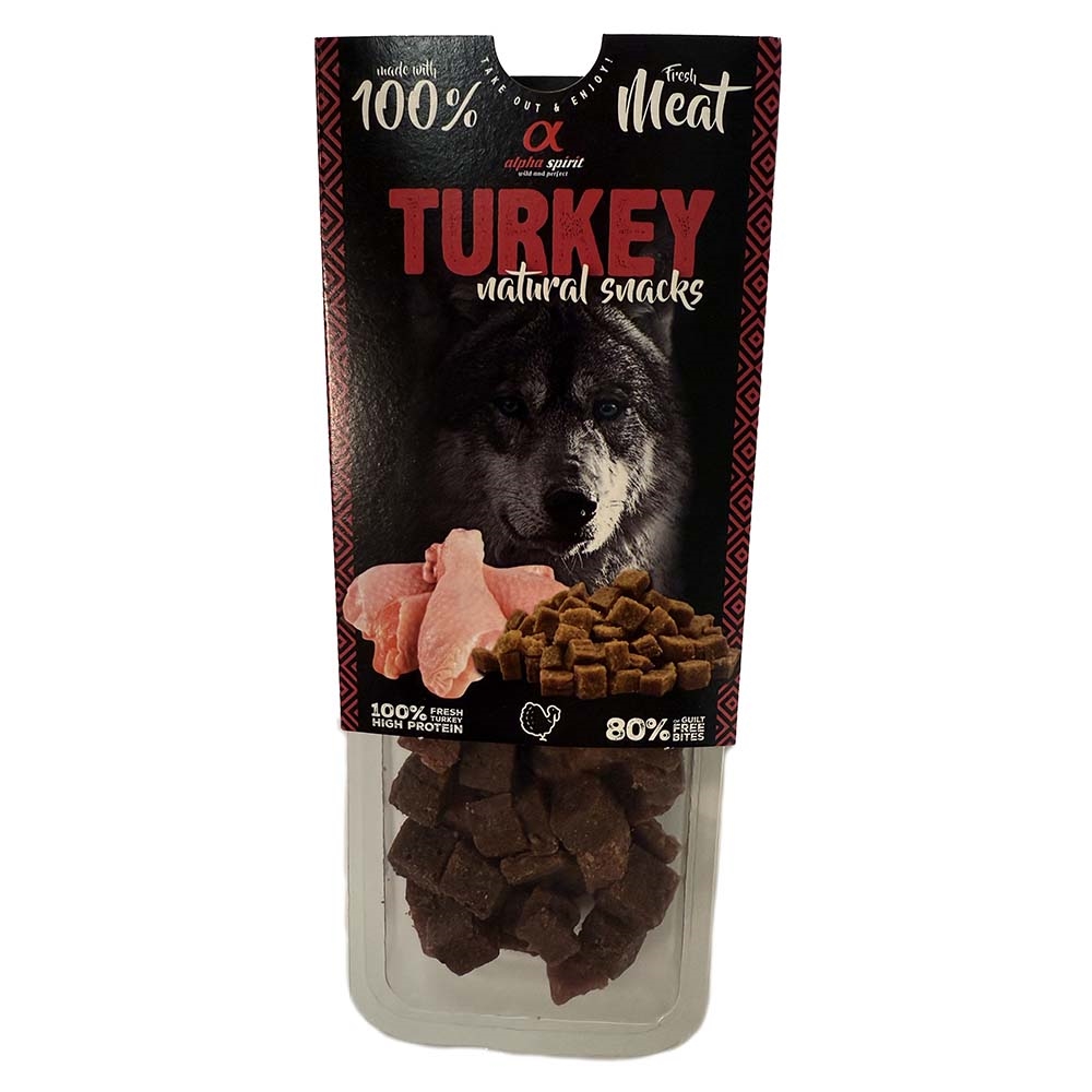 Alpha Spirit godisbitar av 100% färskt kött, bestående av kalkon, kyckling och fläskkött. Godiset har ett högt proteininnehåll och är glutenfritt. I godiset finns inget köttmjöl och de är inte extruderade.