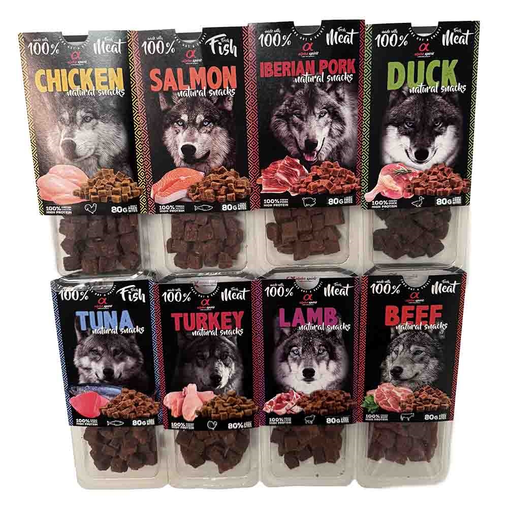 Alpha Spirit godisbitar av 100% färskt kött, bestående av färsk fisk som lax, kyckling och kalkon. Godisarna har ett högt proteininnehåll och är glutenfria. I godisarna finns inget köttmjöl och de är inte extruderade.