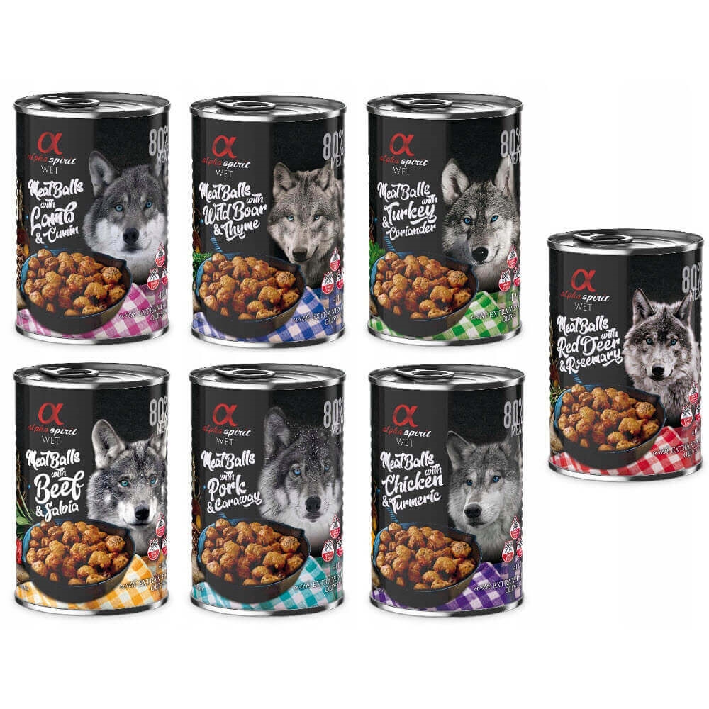 Köttbullar från Alpha Spirit med smak och doft. MegaPack med sju burkar god smak