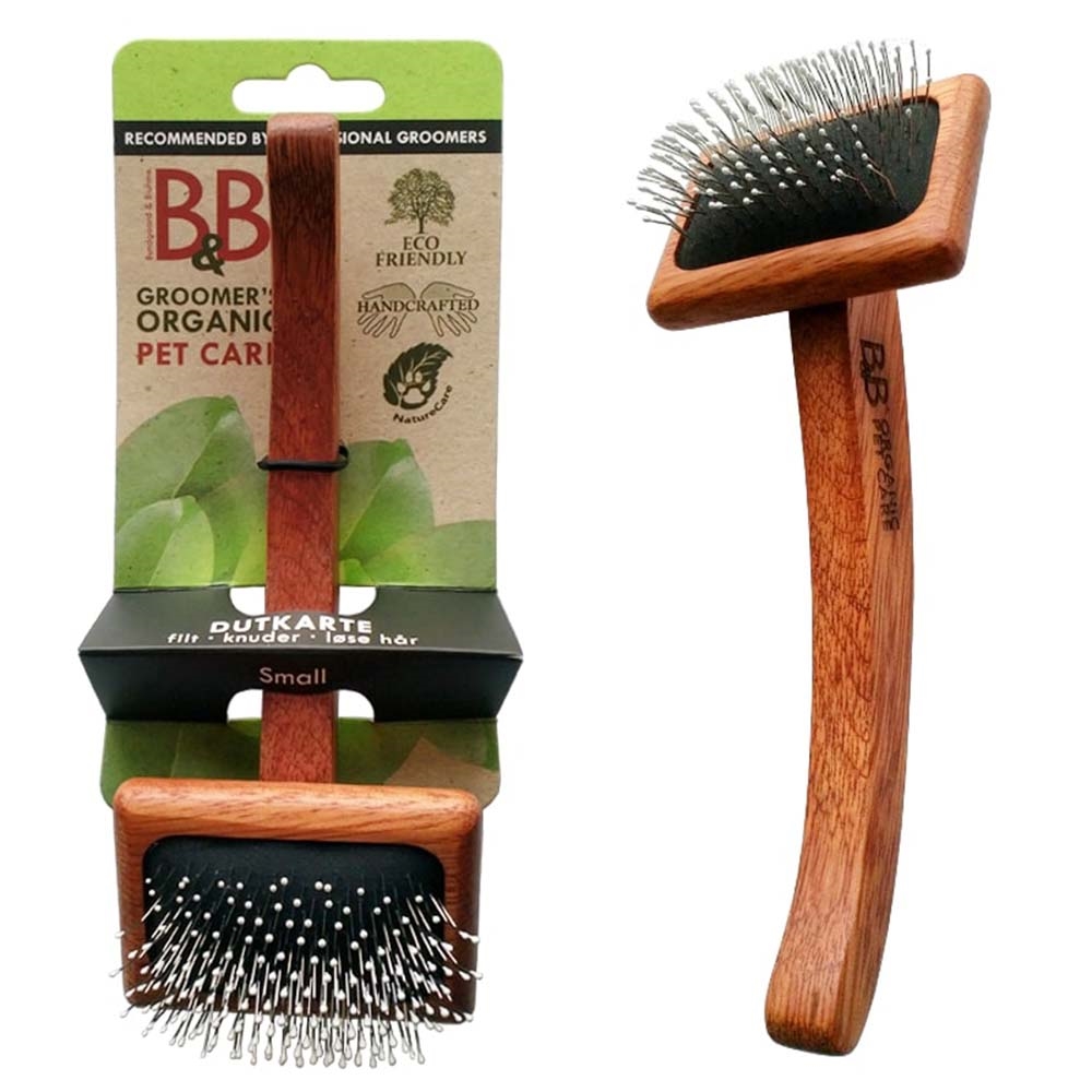 Kardan har ett ergonomiskt handtag tillverkat av hållbart Tamanu-trä, som ger ett bekvämt och säkert grepp under pälsvården. För ett komplett resultat kan dutkardan med fördel kombineras med en av B&B:s kammar - exempelvis guldkam, lättviktskam eller rullkam - så att pälsen lämnas helt tovfri och slät.