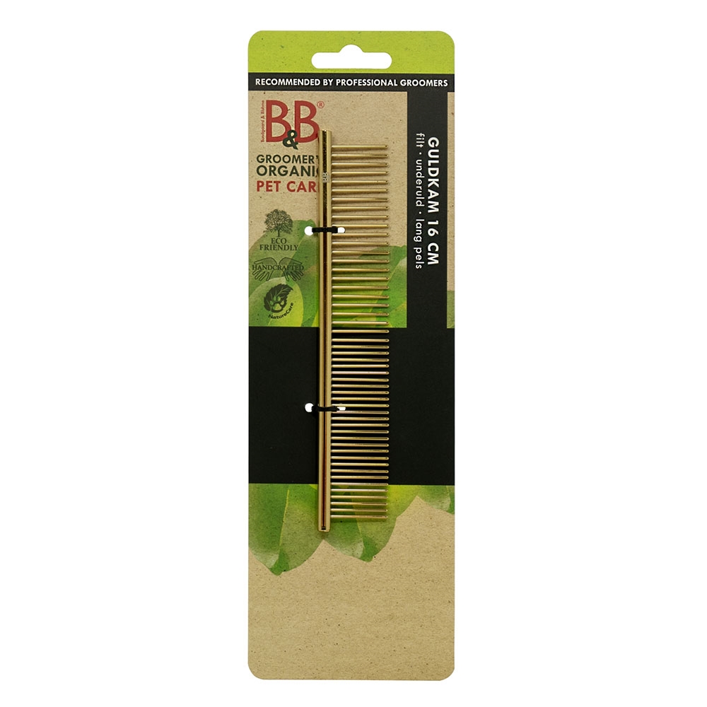 Denna guldkam från B&B är solid och hållbar med rundade tänder som glider varsamt genom pälsen utan att irritera hud eller hår. Den upptäcker små tovor och lösa hårstrån som karda eller borste kan ha missat och lämnar pälsen slät och välvårdad.