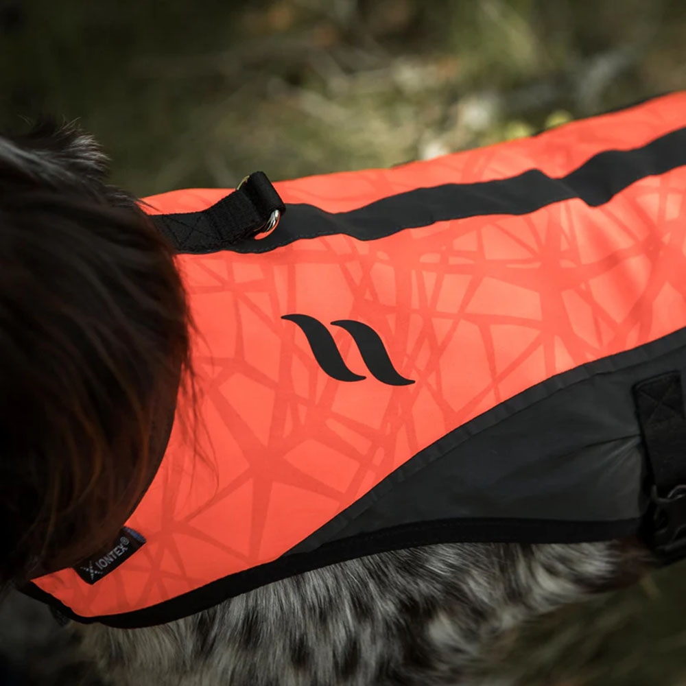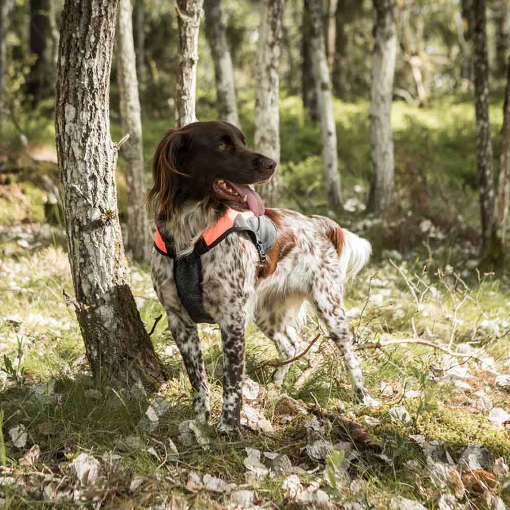 Det yttre materialet är både stretchigt och vattenavvisande. En förstärkt elastisk bröstplatta skyddar hundens bröst och mage mot stick och skador från grenar och andra vassa föremål i undervegetationen.
