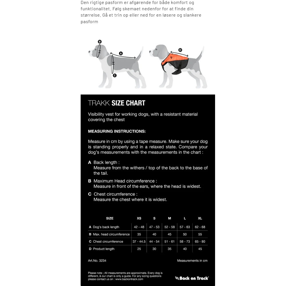 TRAKK är en orange skyddsväst designad för arbetshundar. Den klara och livliga färgen tillsammans med ett reflekterande mönster i materialet maximerar synligheten både i skogen, på marken och i svagt ljus.