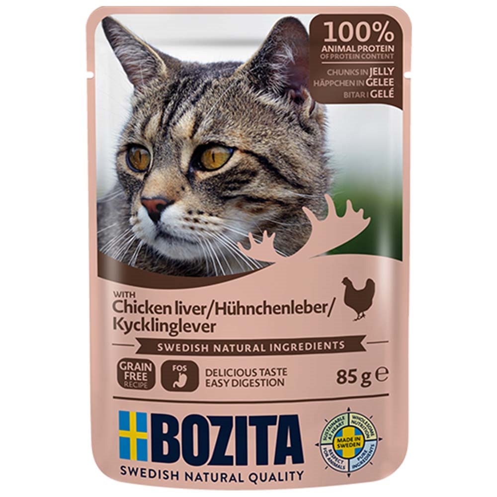 Bozita helfoder för katter bestående av smakrika bitar med kycklinglever i gelé. Ett mycket välsmakande och läckert foder för alla typer av katter, även de kräsna.