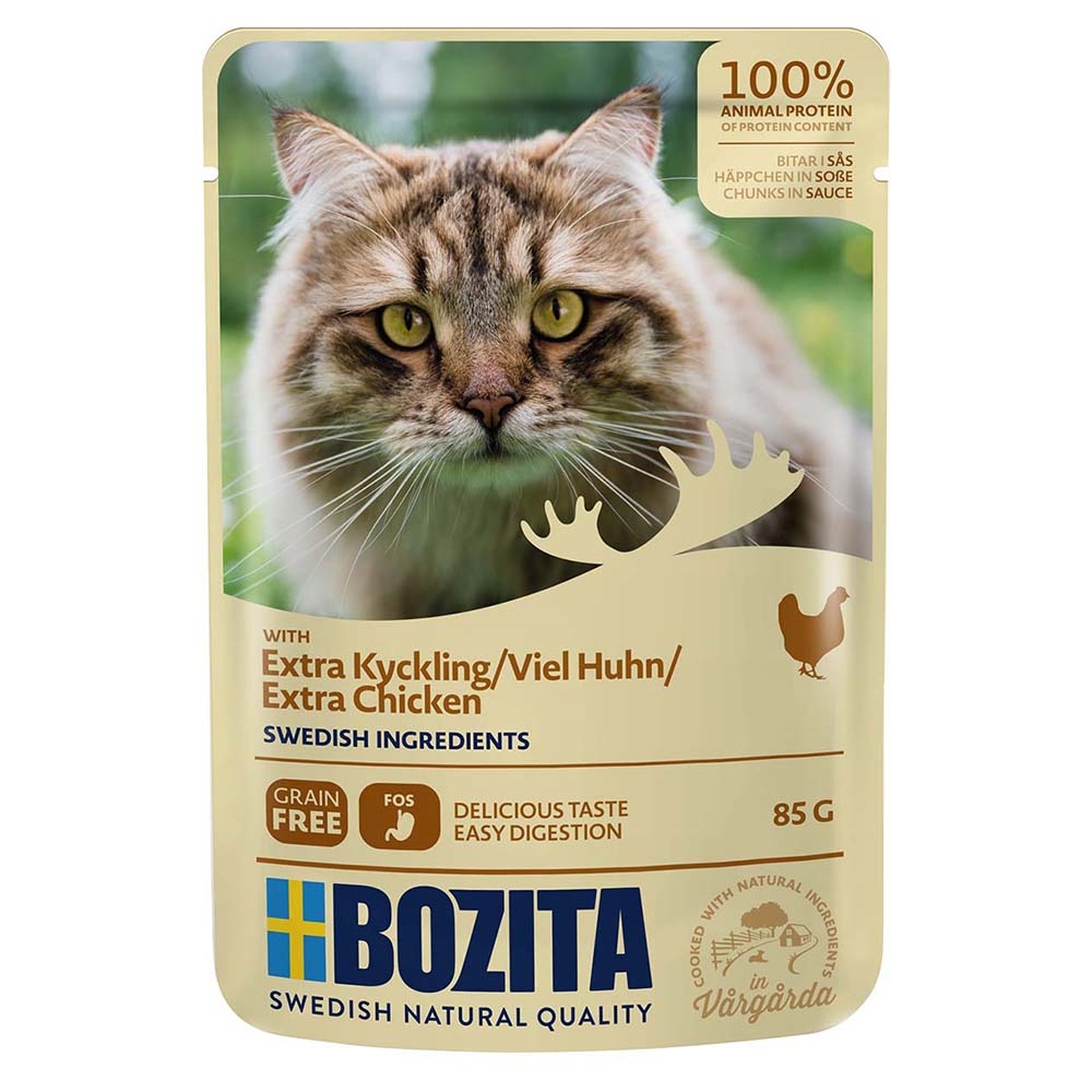 Bozita helfoder för katter bestående av smakrika bitar med kyckling i sås. Ett mycket välsmakande och läckert foder för alla typer av katter, även de kräsna.