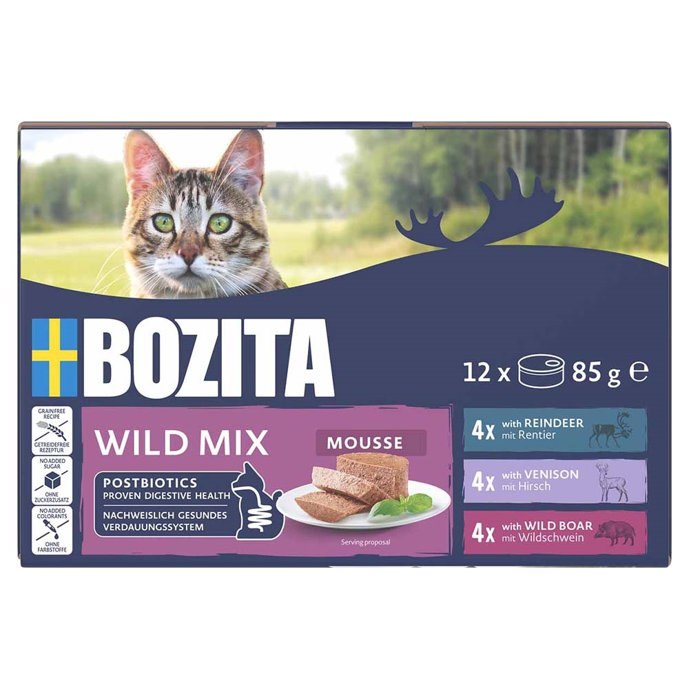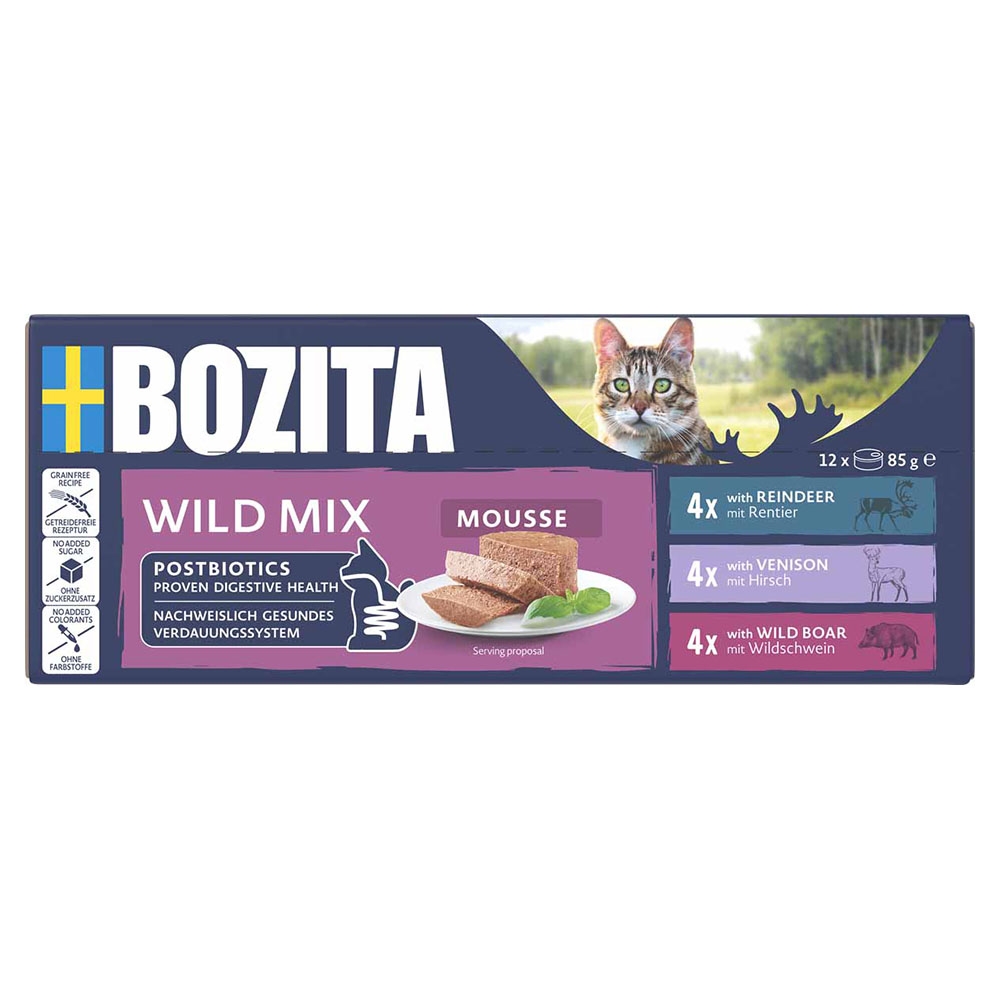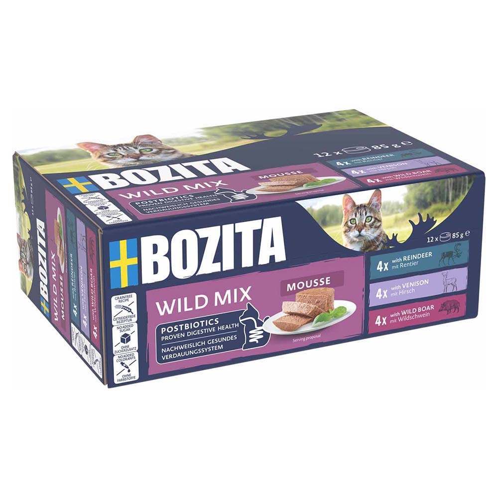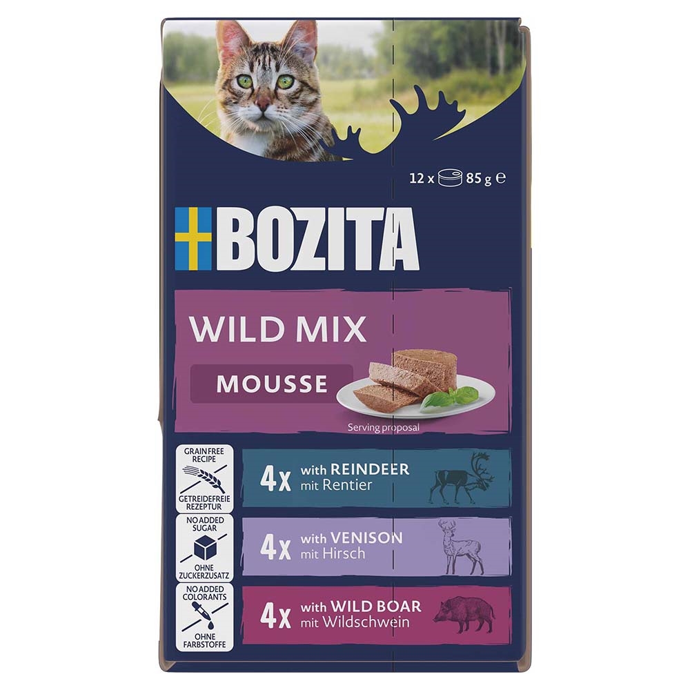 Bozita Mousse Mixed Wild, är ett välsmakande helfoder i mjuk och krämig mousse-konsistens, perfekt för vuxna katter. Denna mixförpackning innehåller 12 praktiska små burkar á 85g - 4 med ren, 4 med hjort och 4 med vildsvin.