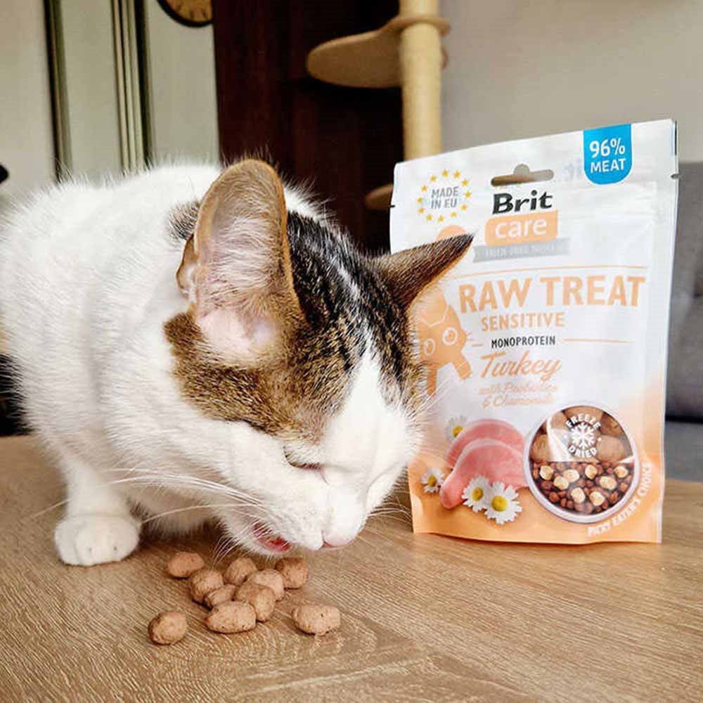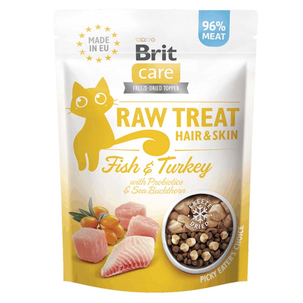 Skäm bort din katt med Brit Hair & Skin frystorkade snacks, gjorda av 96% färsk kalkon och lax.