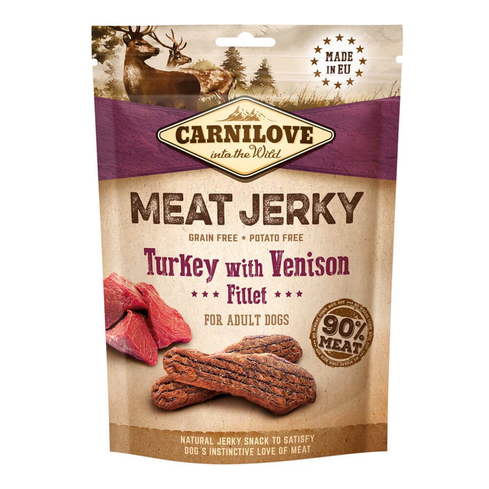 Hundens hälsosamma proteinbar från Carnilove. Jerky Turkey with Venison fillet. 90% kött