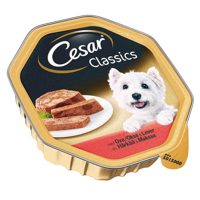 Cesar hund våtfoder med nötkött och kycklinglever.