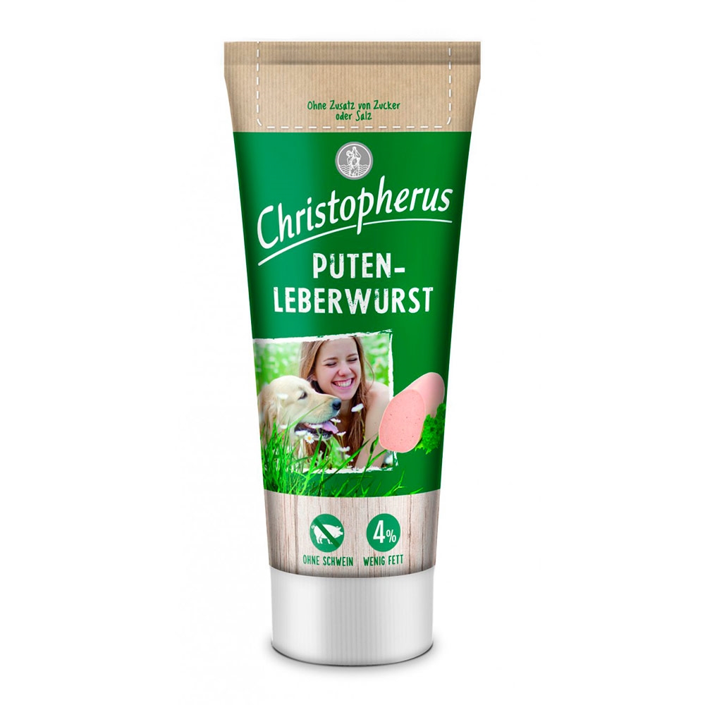 Christopherus Kalkonlever på tub. Läcker kompletteringsfoder för hunden, som är välsmakande och fettsnål. Denna pastatub är lämplig att ha med till träning och kan användas för spår, belöning och till många olika typer av aktivitetsleksaker.
