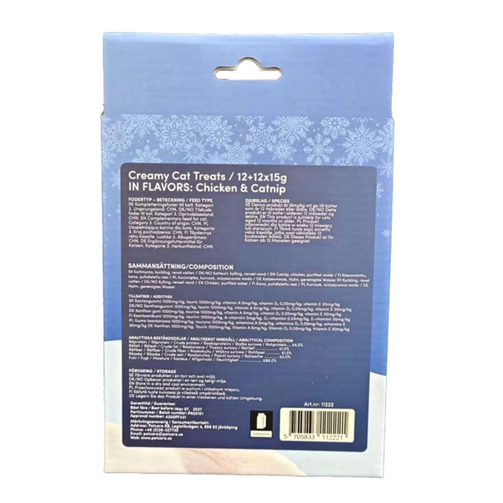 Gläd din katt varje dag i dagarna fram till julafton, med totalt 24 krämiga godissticks. Du får 12 med kyckling och 12 med kattmynta.