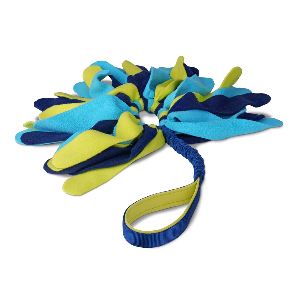 Perfekt för dragkamp, apport och lek, där hunden både kan ha roligt och stärka sina muskler. Den snygga multi/mönstrade färgen i mörkblå, ljusblå och ljusgrön gör leksaken både frestande för hunden och stilfull för ägaren.