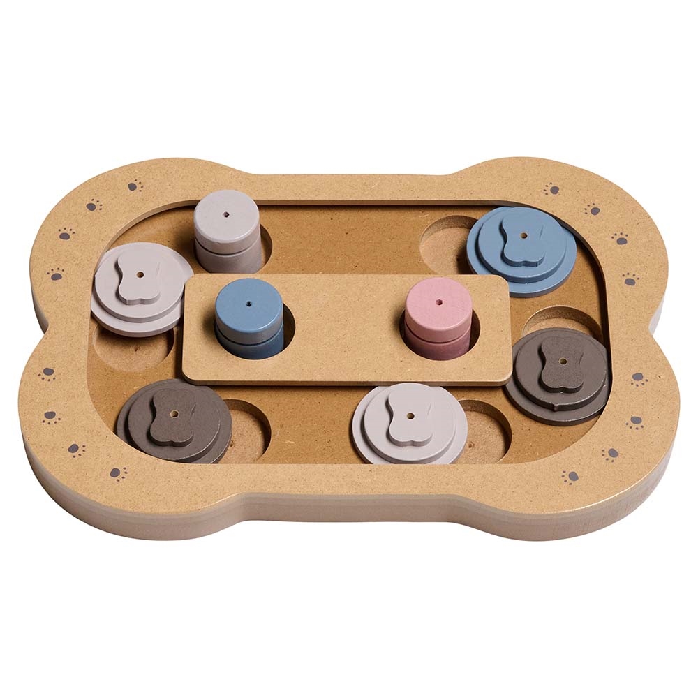 Detta aktivitetsspel för hundar är en interaktiv leksak som utmanar din hunds intelligens och bidrar till mental stimulans. Hunden måste använda sin nos, tassar eller mun för att lyfta, skjuta eller vrida delar av pusslet för att nå belöningen.