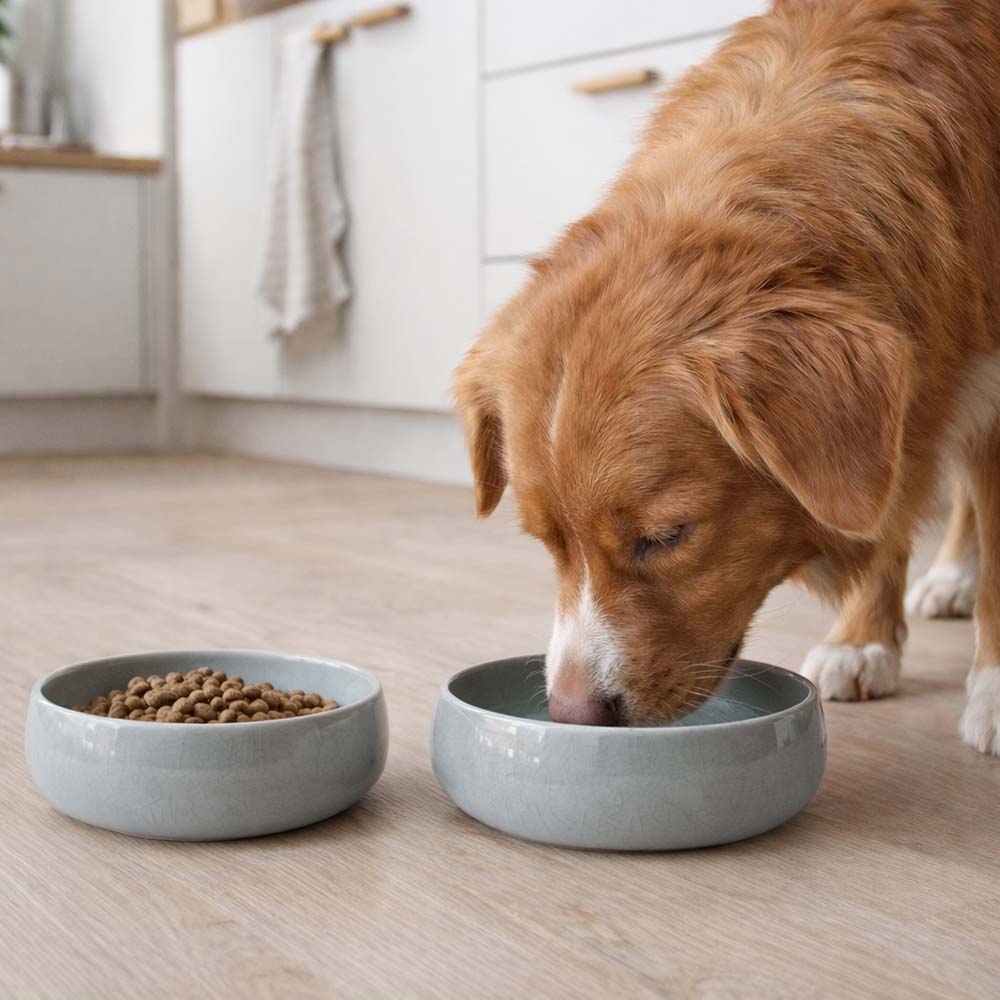 Med sin fina blanka, krackelerade design får du en skål som passar perfekt in i alla hundhem.