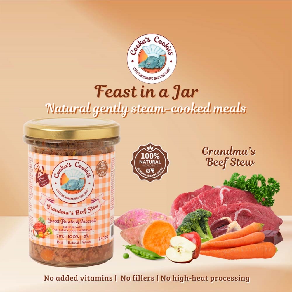 Detta hundfoder har en autentisk smakupplevelse, eftersom det är tillagat precis som förr i tiden. Måltiden här är varsamt ångkokt och gjord med färska ingredienser av mänsklig kvalitet, kärleksfullt konserverad i en glasburk, precis som mormor brukade göra.