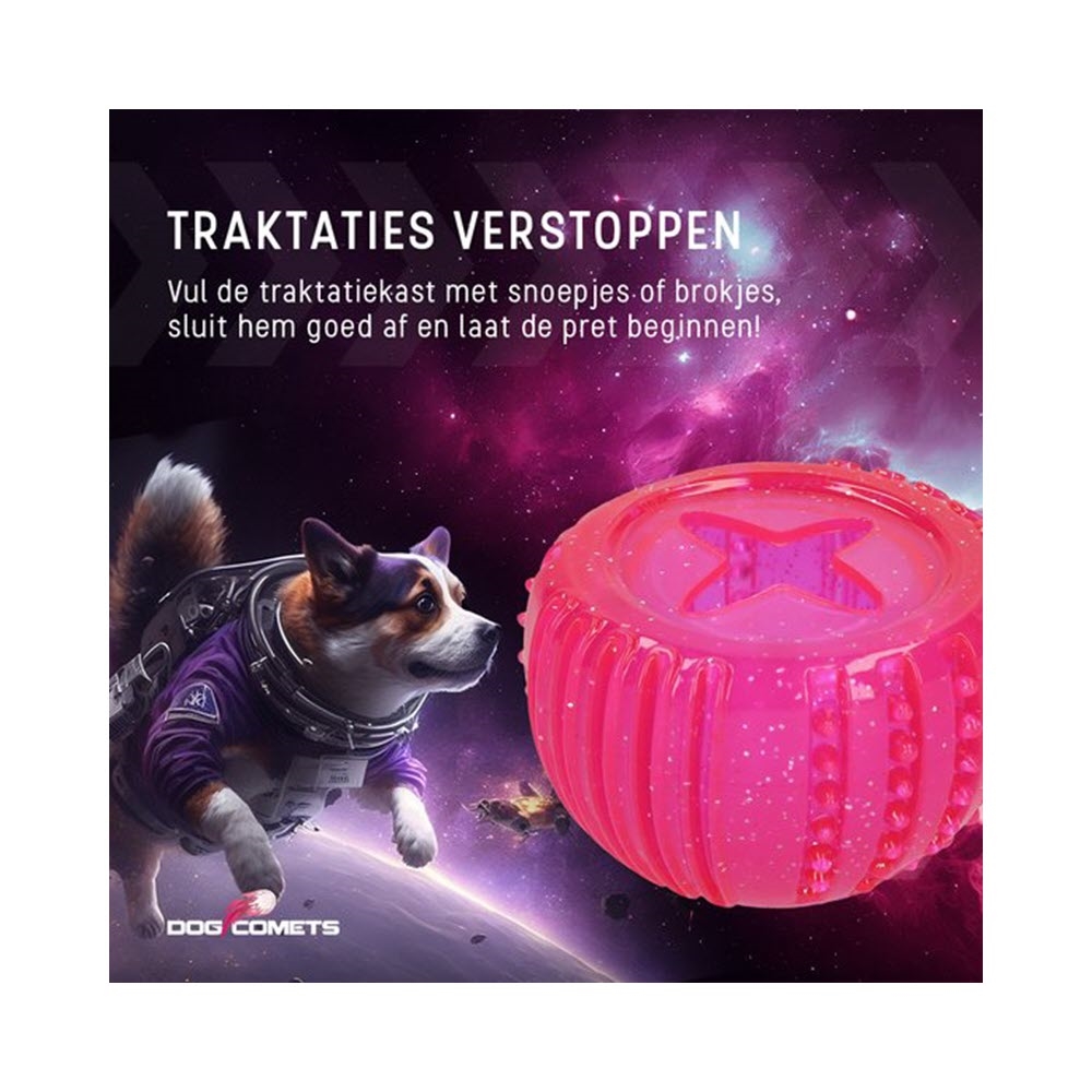 Wauuuww en rolig boll har landat från Dog Comets universum. Den är verkligen häftig, tillverkad av TPR-gummi, som är helt giftfritt och särskilt gummi för hundleksaker av hög kvalitet. Denna boll har många funktioner. Den stimulerar hundens sinnen och tillfredsställer det naturliga tugginstinktet. Du kan lägga godbitar i bollen och ge din hund en helt särskild utmaning med att få ut dem.
