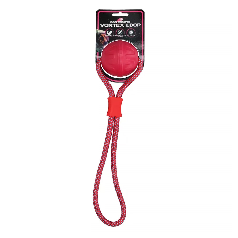 Dog Comets Vortex Loop är skapad för aktiva hundar som älskar apport och rörelse. Kombinationen av en slitstark boll och ett starkt, reflekterande rep gör leksaken lätt att kasta långt - och lätt för hunden att få tag i. Den klara rosa färgen och de reflekterande detaljerna ökar synligheten, även när ljuset är lågt.