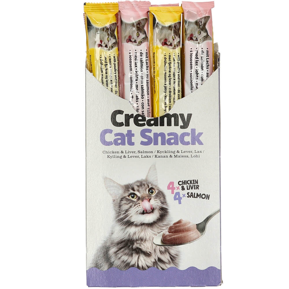 Katter älskar flytande saker. Dessa kattsnacks består av små påsar fyllda med "salsa" som vi kallar det. En blandning av kyckling och lever, samt lax kan du skämma bort din härliga katt med. Du öppnar bara en påse och häller ut den i kattens skål.
