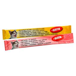 Läckra flytande kattsnacks i påse, redo att hälla ut i skålen. Med smak av kyckling/lever och lax.