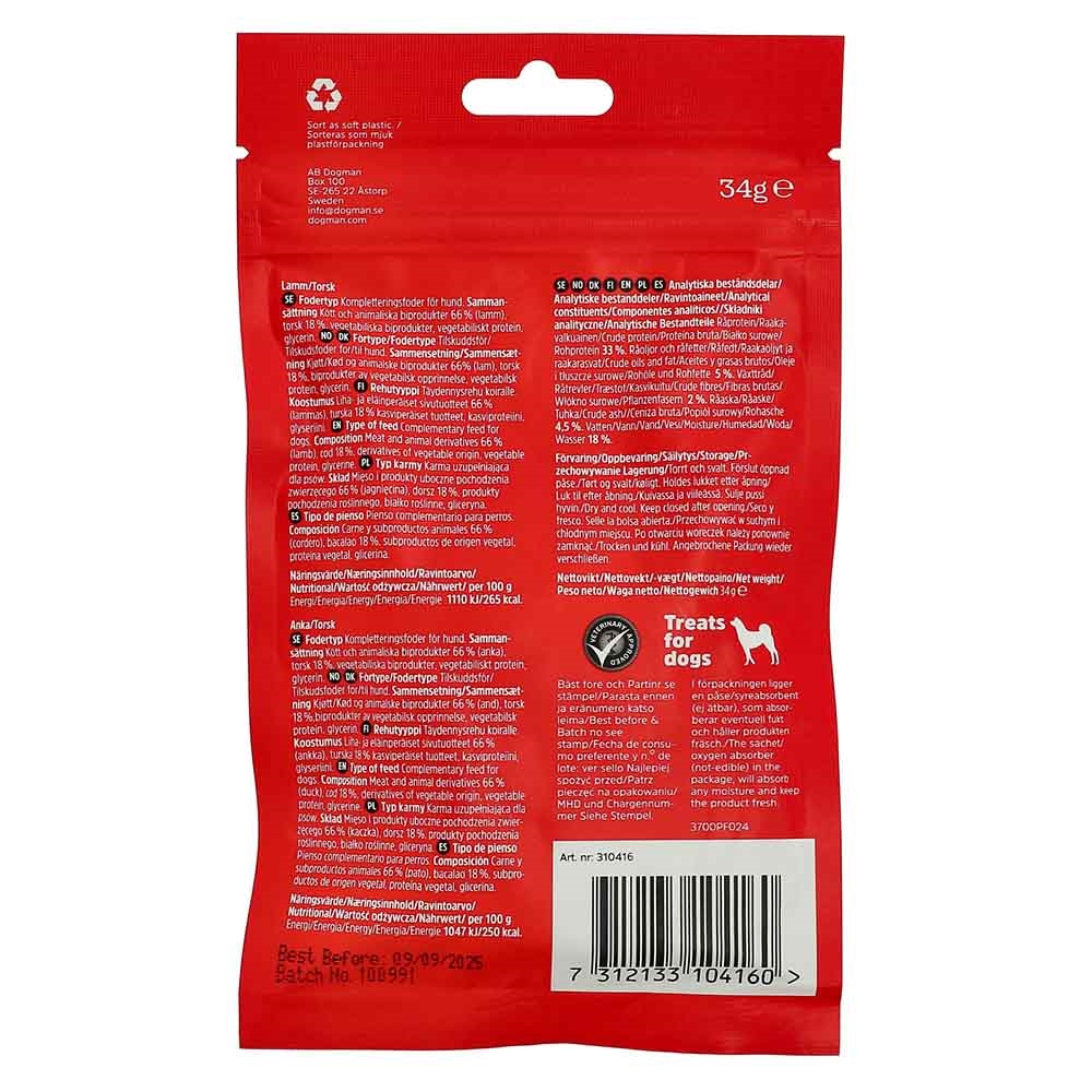 Denna läckra hundgodis är 100% spannmålsfri och innehåller inget socker. Påsen består av 2 st. roliga godis snurror, som består av lamm/torsk och anka/torsk.