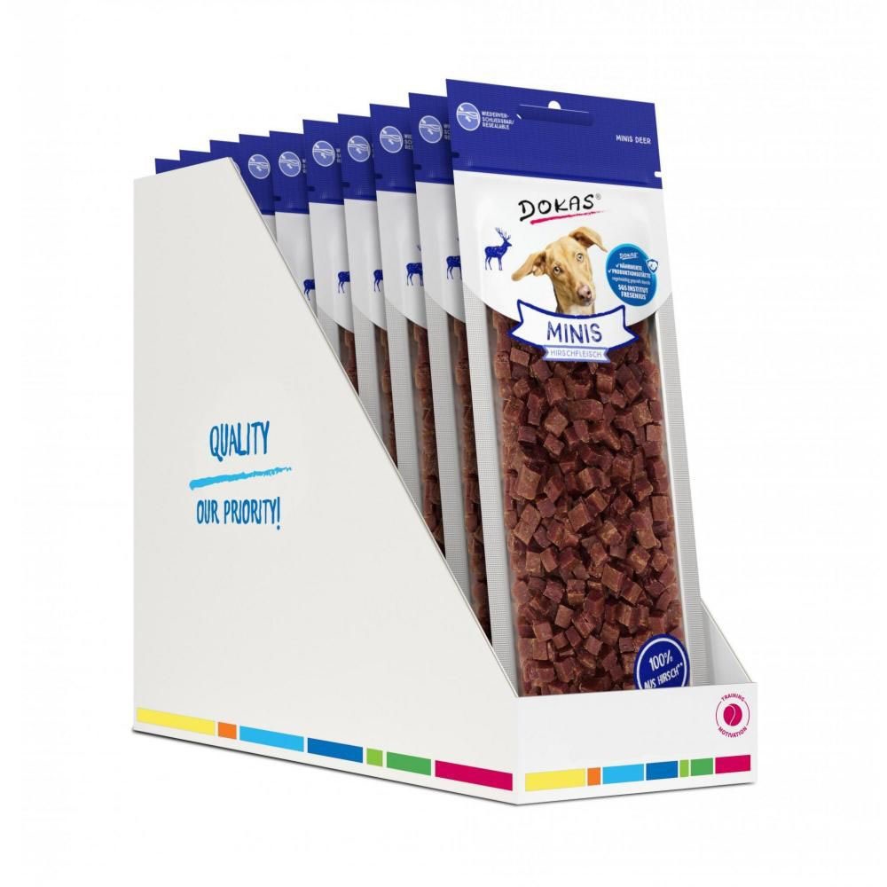 Dokas Minis med kronhjort är små godbitar gjorda av läckert kvalitetskött från kronhjort. Dessa hundgodis är den perfekta motivationen för varje träningspass. De små bitarna är idealiska att använda under träning eftersom man kan ge många av dem.