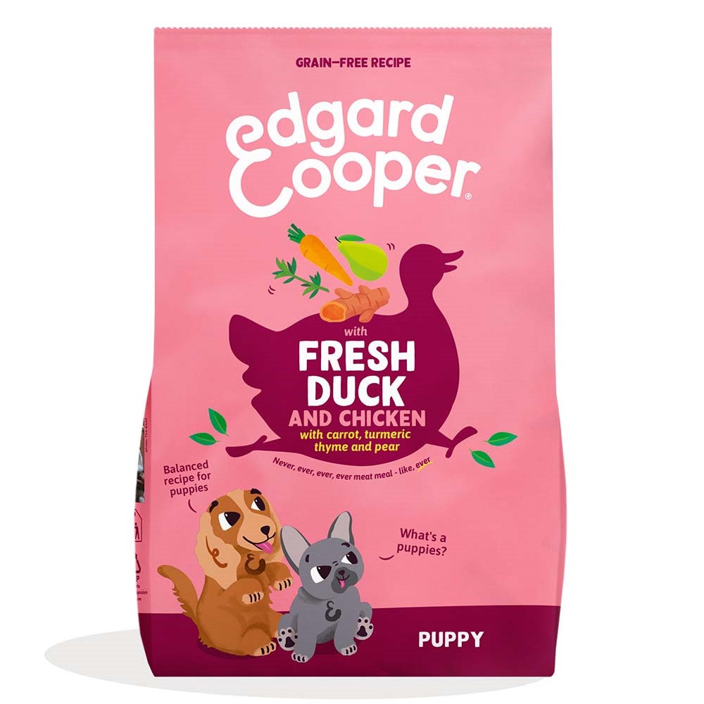 Kornfritt valpfoder från Edgard Cooper. Med anka och kyckling.