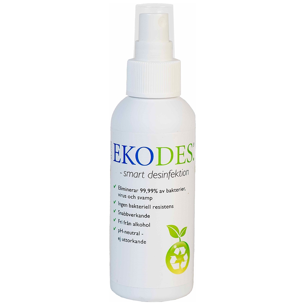 Ekodes erbjuder husdjursägare detta säkra och effektiva desinfektionsmedel. Produkten är nämligen helt fri från giftiga kemikalier och är pH-neutral. Den aktiva ingrediensen är det naturliga ämnet hypoklorsyra. Hypoklorsyra förekommer naturligt i de vita blodkropparna i immunsystemet, hos både människor och djur, där det fungerar som en del av kroppens eget desinfektionsmedel, för att bekämpa infektioner.
