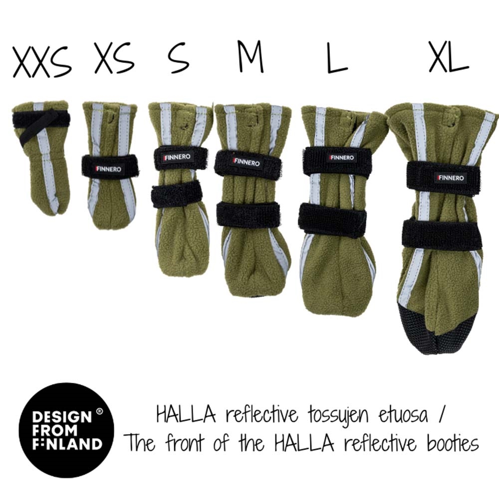 Dessa Finnero Halla Booties är designade med reflekterande ränder för att skapa mer säkerhet i mörkret. Din hunds tassar förtjänar skydd i toppklass, och med dessa lätta och mjuka Halla-stövlar blir din hunds tassar skyddade mot snö, is och frost. De förhindrar också snö och slask från att klumpa sig mellan din hunds trampdynor.