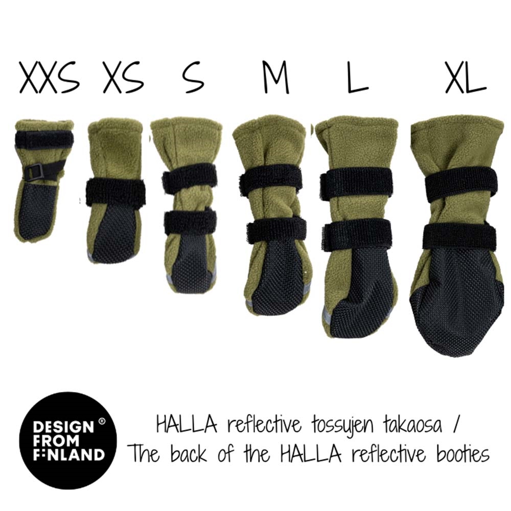 Halla-skorna är gjorda av flexibelt fleece av hög kvalitet och erbjuder exceptionell komfort och hållbarhet. Den halkfria, vattenavvisande sulan håller tassarna relativt torra och stabila på hala ytor, medan slitsen framtill och kardborrestängningen (hook & loop) gör dem snabba och enkla att ta på.