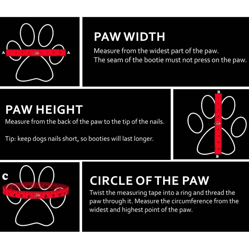 B) Tasslängd: Mät bakom trampdynorna och hela vägen ut till klorna. (Tips: Kom ihåg att hålla klorna korta nog för att förhindra att stövlarna river.)
