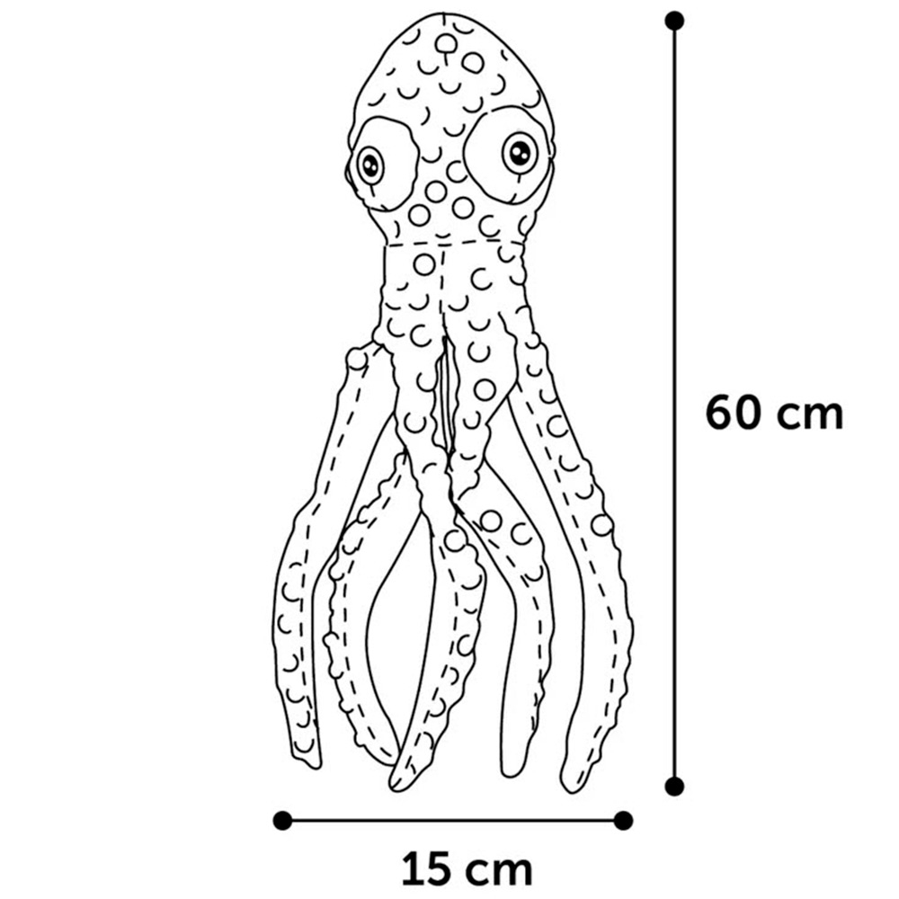 Denna härliga färgglada bläckfisk är superlämplig för de stora hundarna, eller de hundar som älskar att springa runt med stora nallar. Bläckfisknallen har 5 långa ben och piper i huvudet. På baksidan av huvudet är det fastsytt en etikett där det står "Squeak Me".