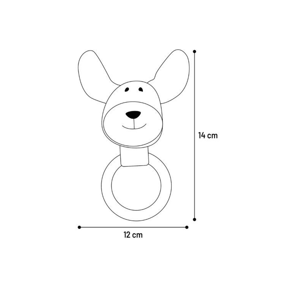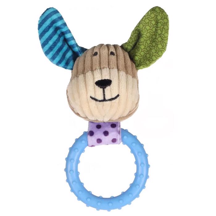 Detta söta gosedjur är utformat som en hund. I huvudet finns ett pipljud som små valpar älskar. Den ljusblå hårda gummiringen är bra för att massera de ömma valptänderna och tandköttet.