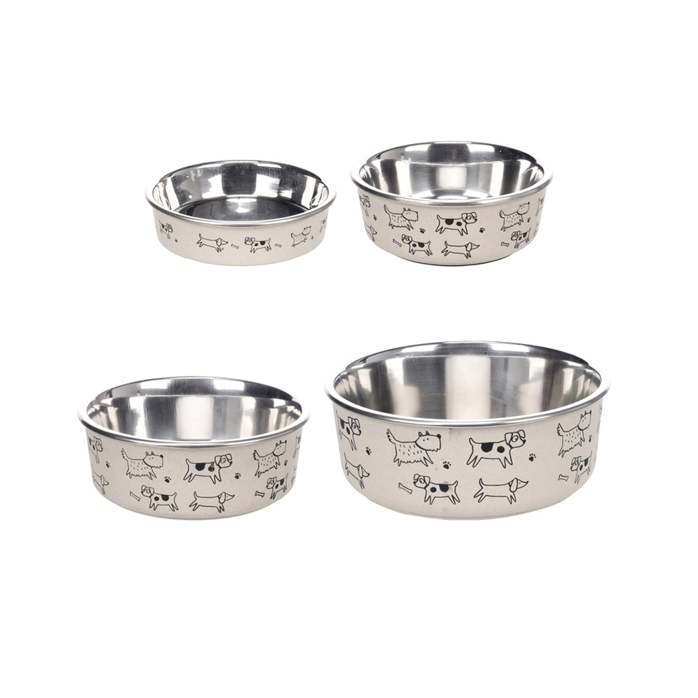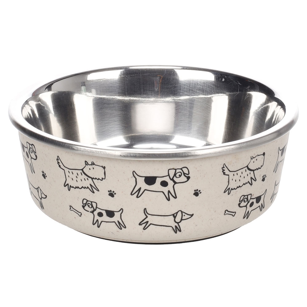 Denna gulliga beige skål är designad med de sötaste hundarna hela vägen runt på utsidan.