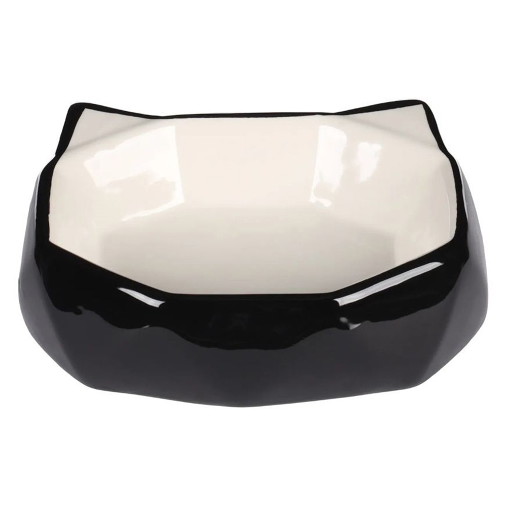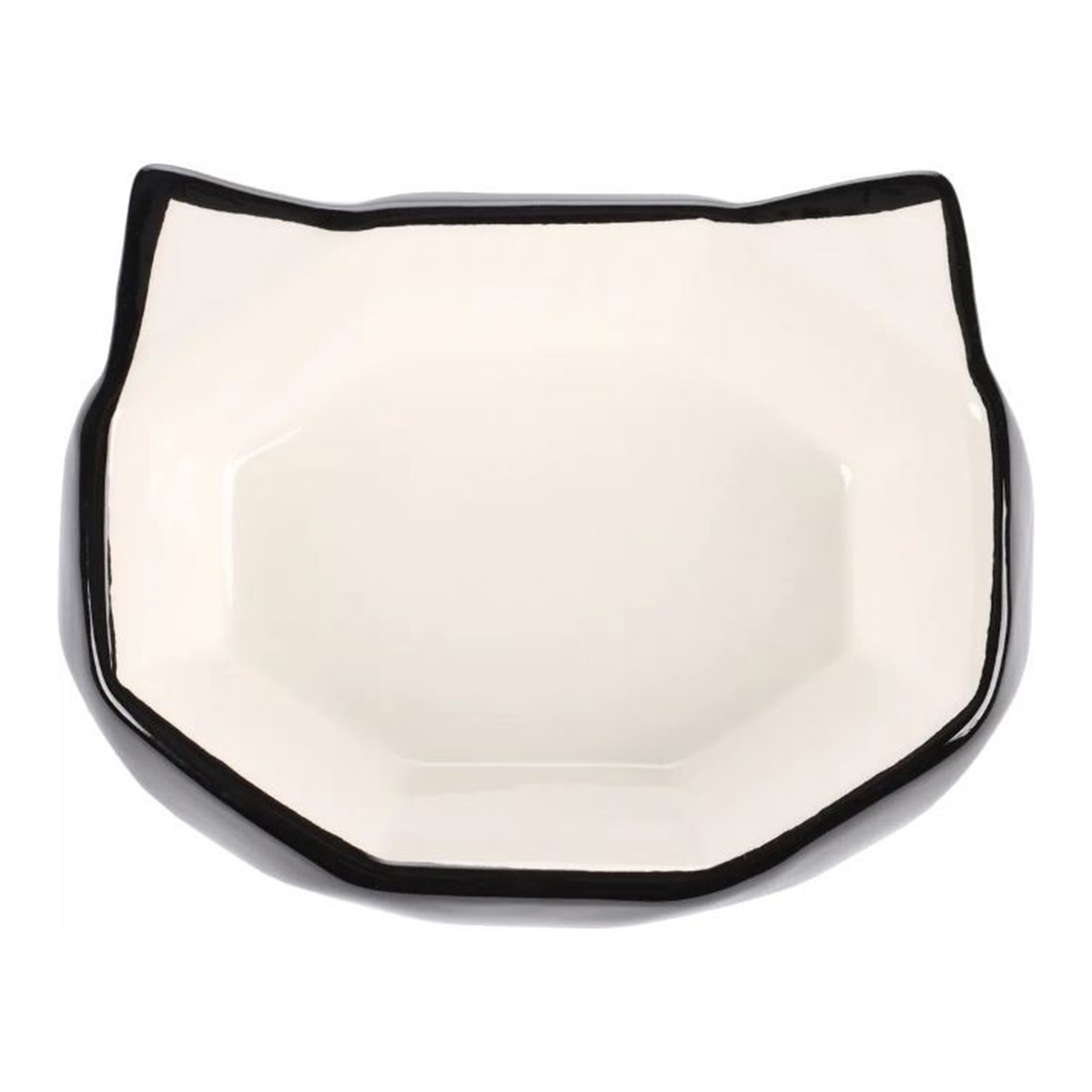 Denna söta kattskål är lämplig för kattens torrfoder, våtfoder eller vatten. Skålen är gjord i glaserad keramik och har formen av ett katthuvud. Utsidan av skålen är svart och insidan är vit.
