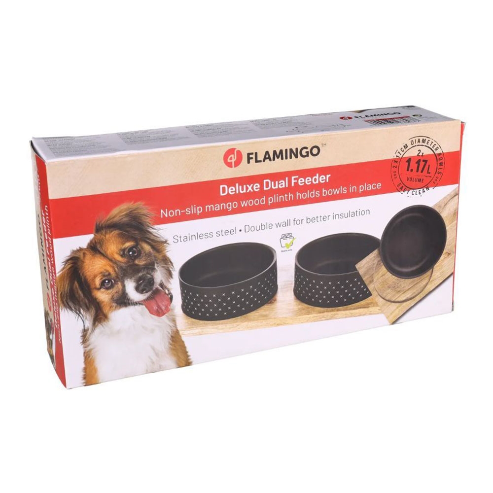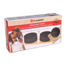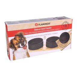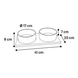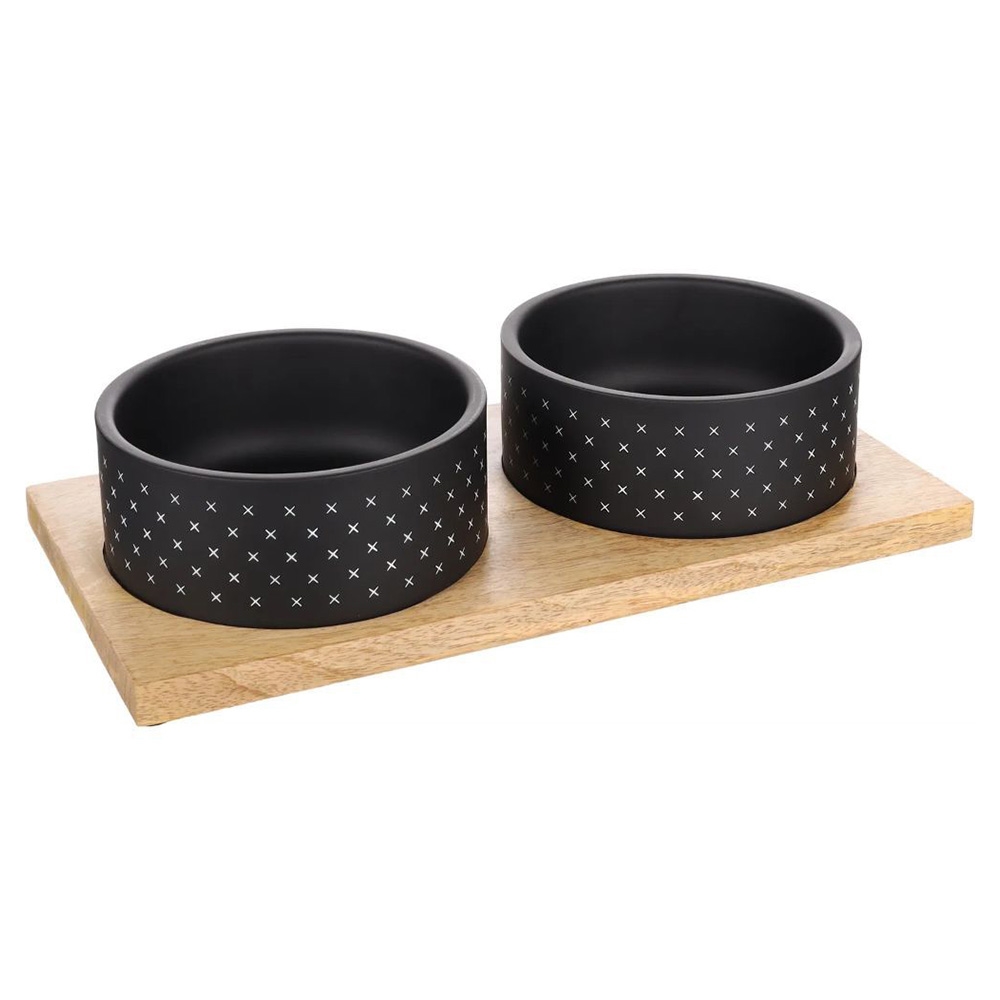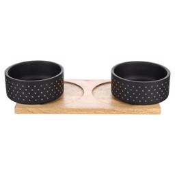 Dessa 2 skålar är designade i svartlackerat rostfritt stål. Skålarna står på en praktisk trähållare. Skålarna har dubbla väggar, som håller innehållet svalt längre.