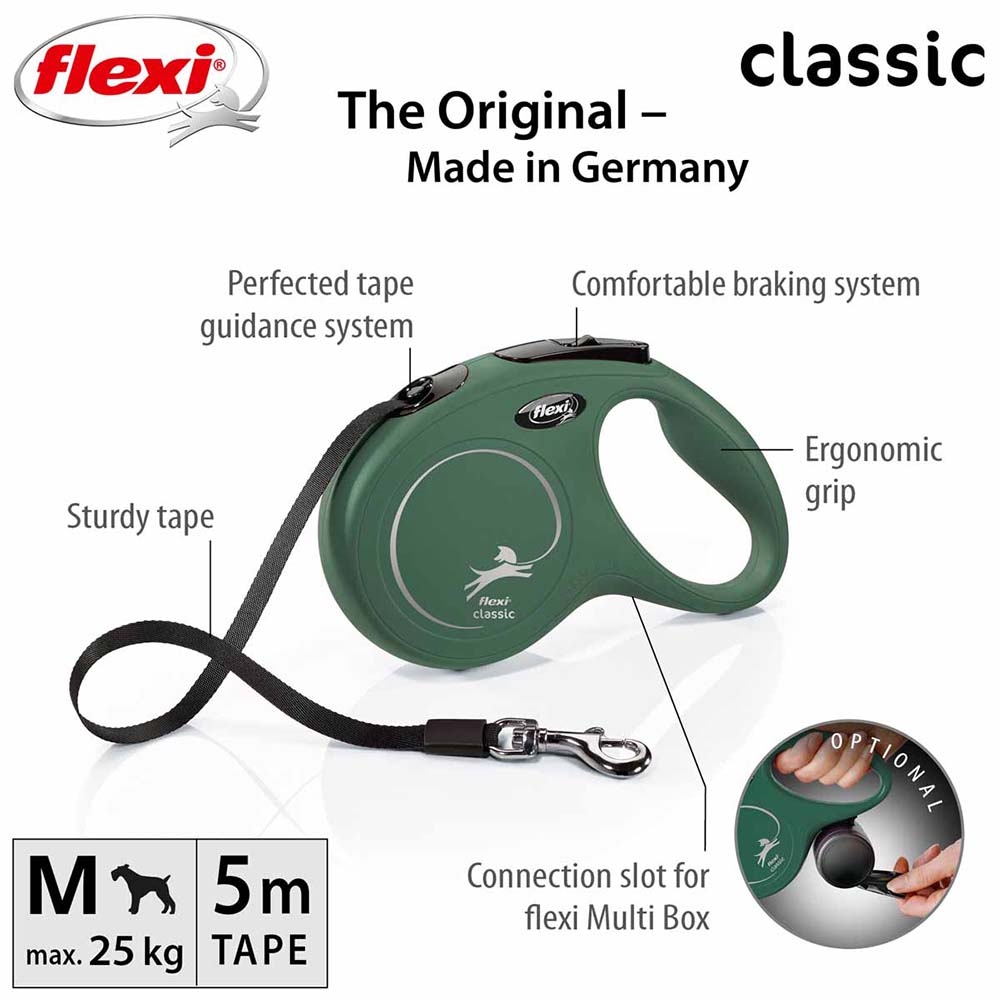 Flexi hundflexline i str. Medium - Design New Classic Olive. Linan är en bandlina och den är 5 meter för max 25 kg hund.