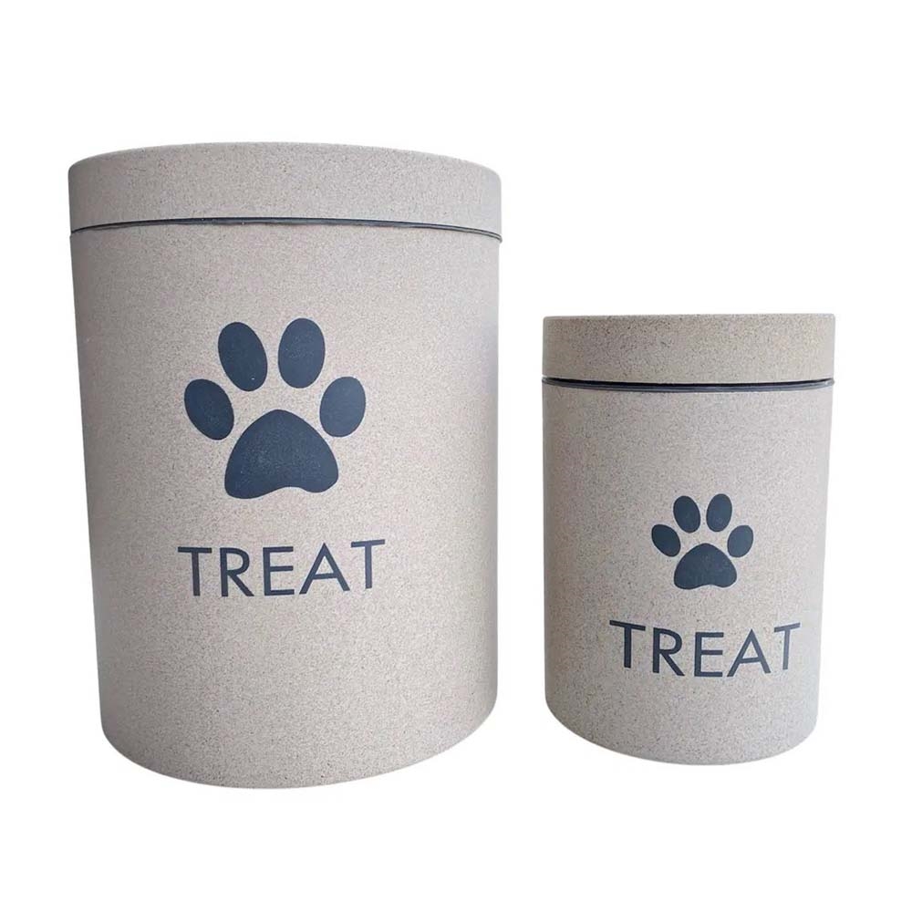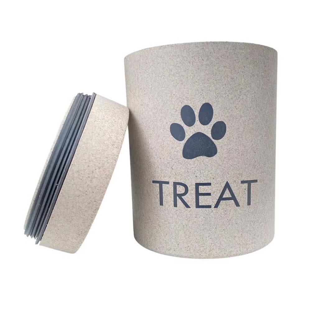 Förtjusande beigefärgad godisbehållare med en söt tass och text utanpå. Godisburken är tillverkad med ett lufttätt lock, så hundens eller kattens godbitar bevarar sin fräschör.