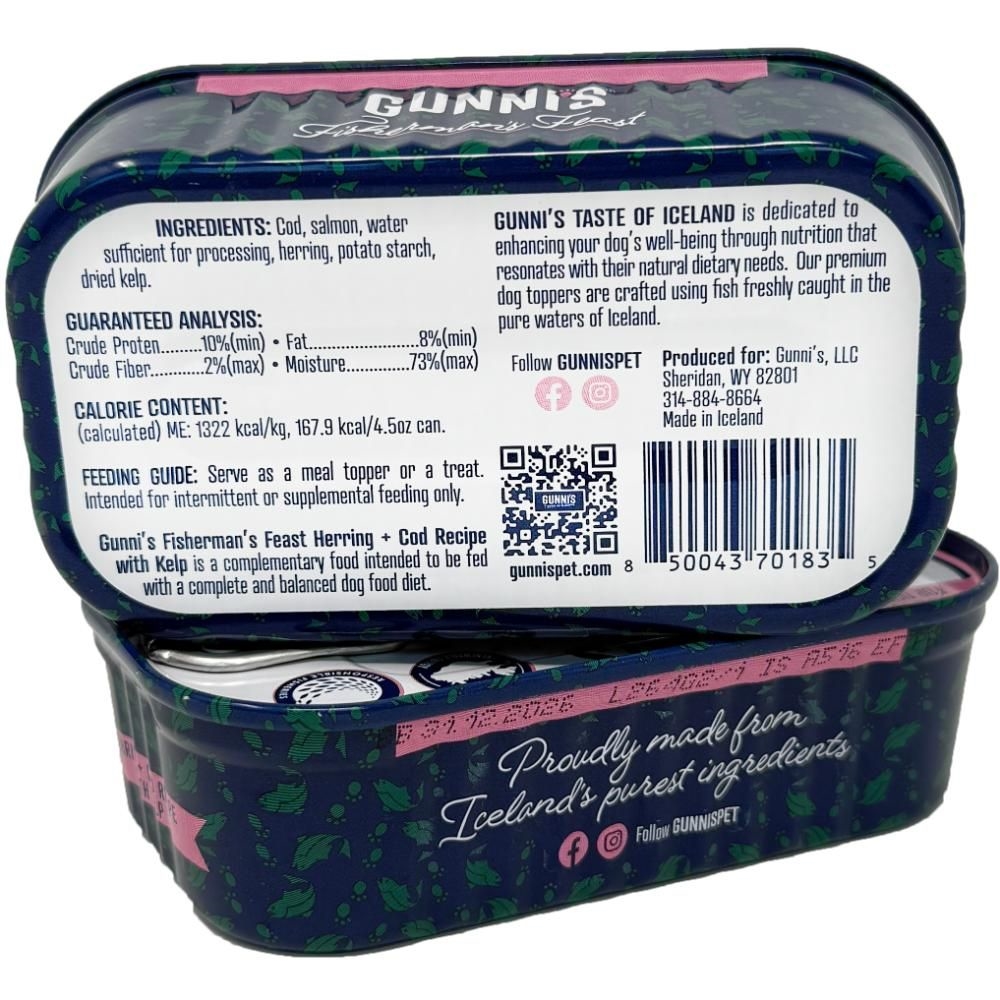 Gunnis Fisherman's Feast Sill och Torsk med Tång. Ett läckert kompletteringsfoder avsett att ges tillsammans med ett komplett och balanserat hundfoder för att göra det extra spännande för hunden. Denna premiumtopping är tillverkad av fisk fångad i det rena isländska vattnet.