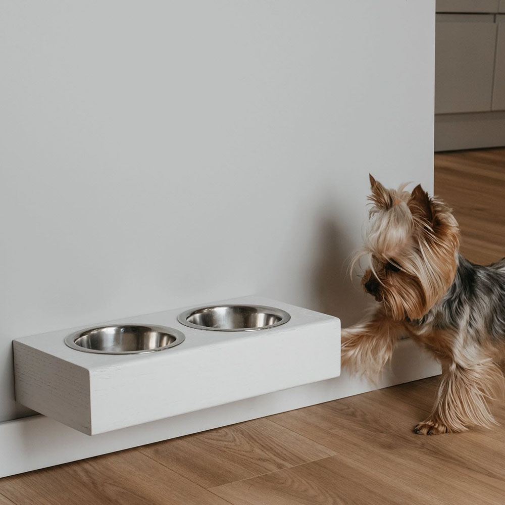 Handgjord Designer Väggmonterad Matskål Till Katter och Små Hundar i Vitmålad Ek