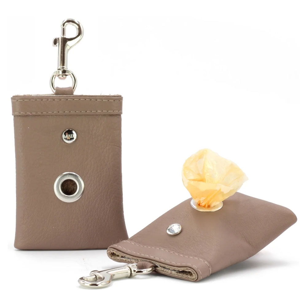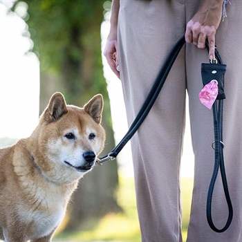 Påshållare i nappaläder, för hundens bajspåsar.