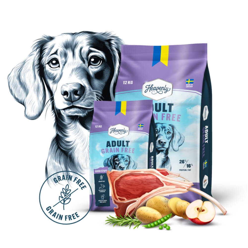 Heavenly Adult Grain Free - Ett svenskproducerat spannmålsfritt helfoder för vuxna hundar av alla raser med lamm. Fodret är näringsmässigt balanserat, milt och skonsamt, vilket är bra för hundar med känsliga magar.