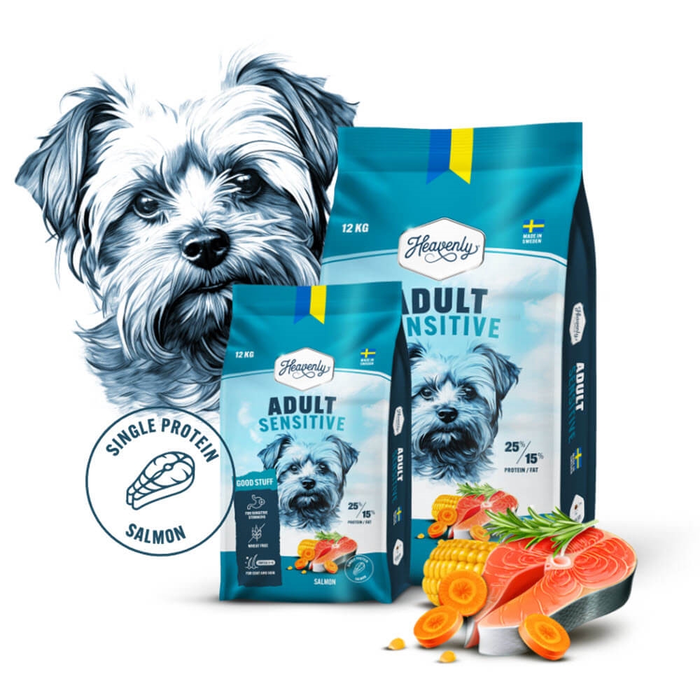 Heavenly Sensitive - Ett svenskproducerat spannmålsfritt helfoder för vuxna hundar av alla raser med norsk lax som enda animaliska protein. Fodret är näringsmässigt balanserat och är särskilt lämpligt för hundar med känsliga magar, hud- och pälsproblem, eftersom fodret är milt och skonsamt. Ett välsmakande foder som är utmärkt för kräsna hundar.