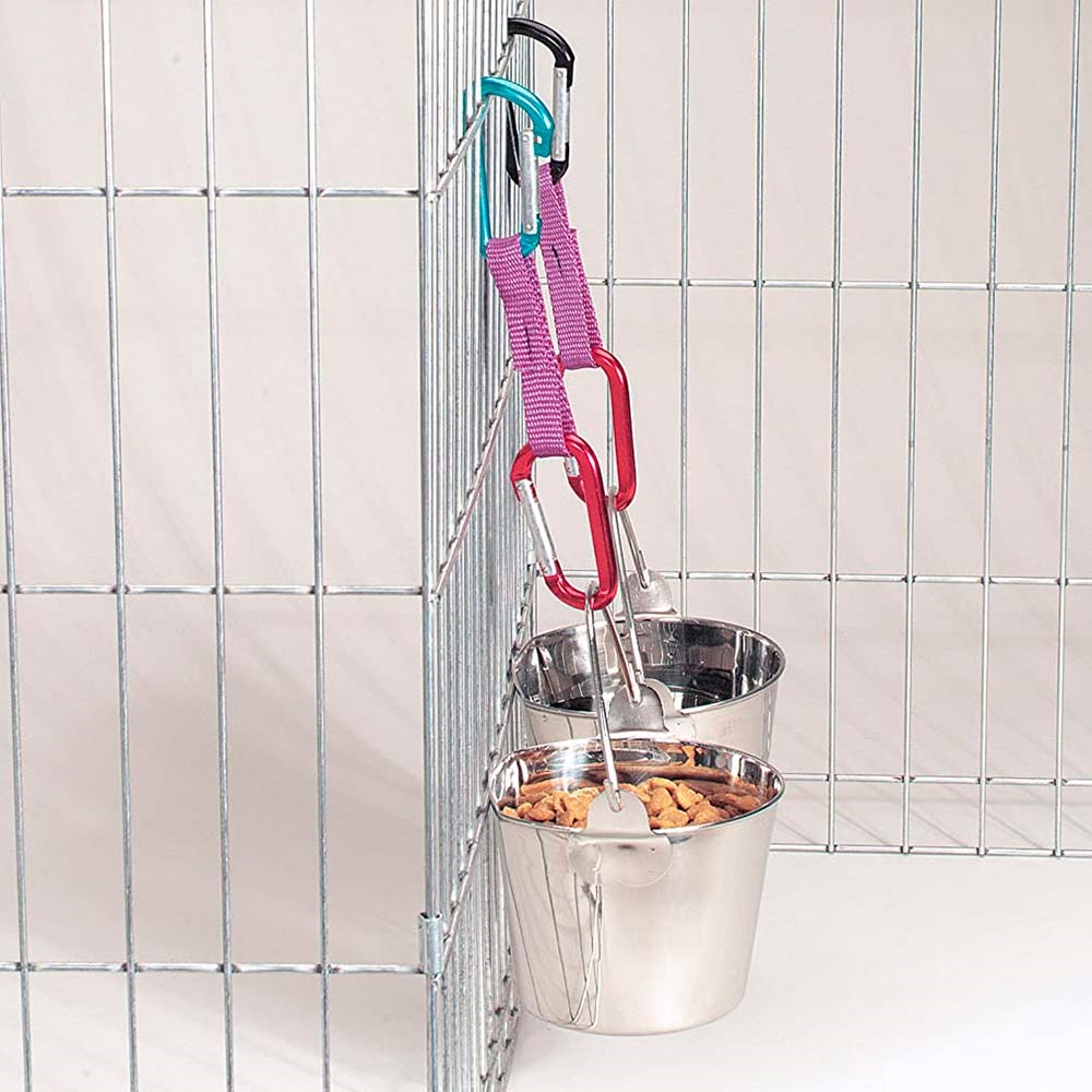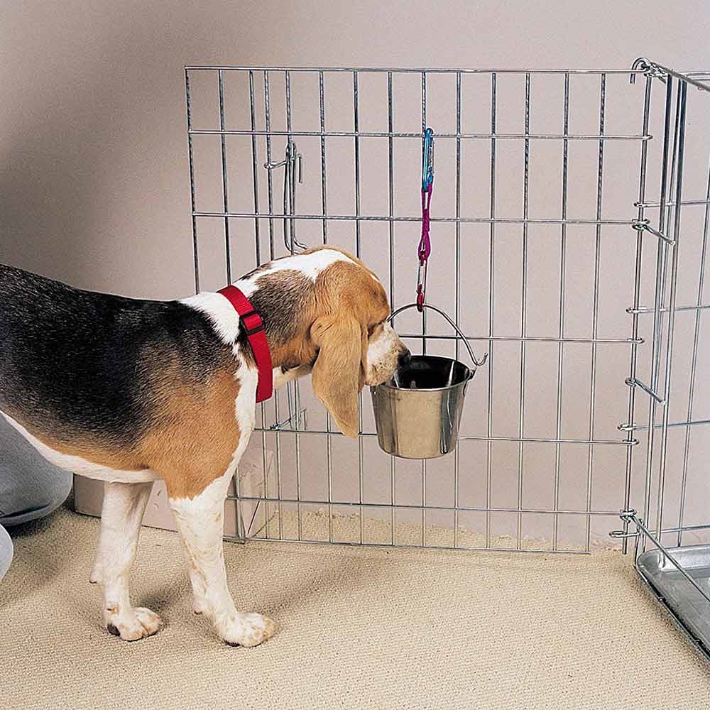 Denna smarta hink är platt på ena sidan, så den kan hängas på hundburen eller utställningsburen. Många har den också bara stående på golvet eller marken, men för att hunden inte ska kunna välta den, är det smart att hänga upp den.