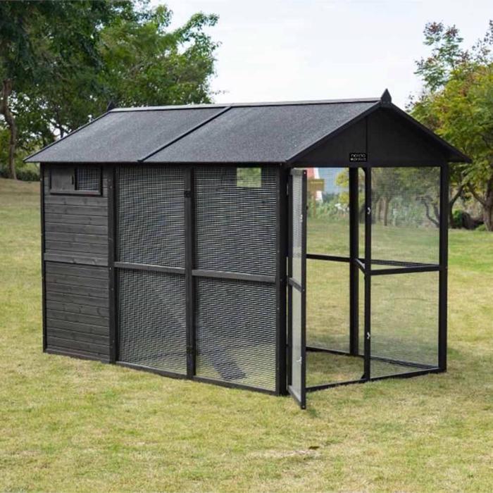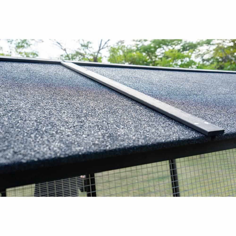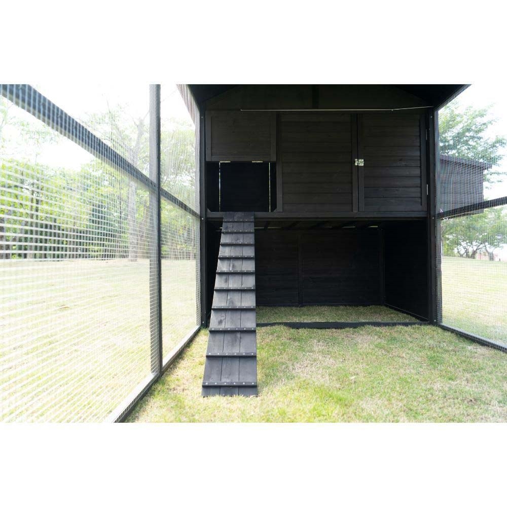 Både hus och gård är täckta med ett väderbeständigt tak. Eftersom hönshuset är gjort i trä, är det en bra idé att underhålla det med en träbehandling som är lämplig för djurhållningsmiljöer.
