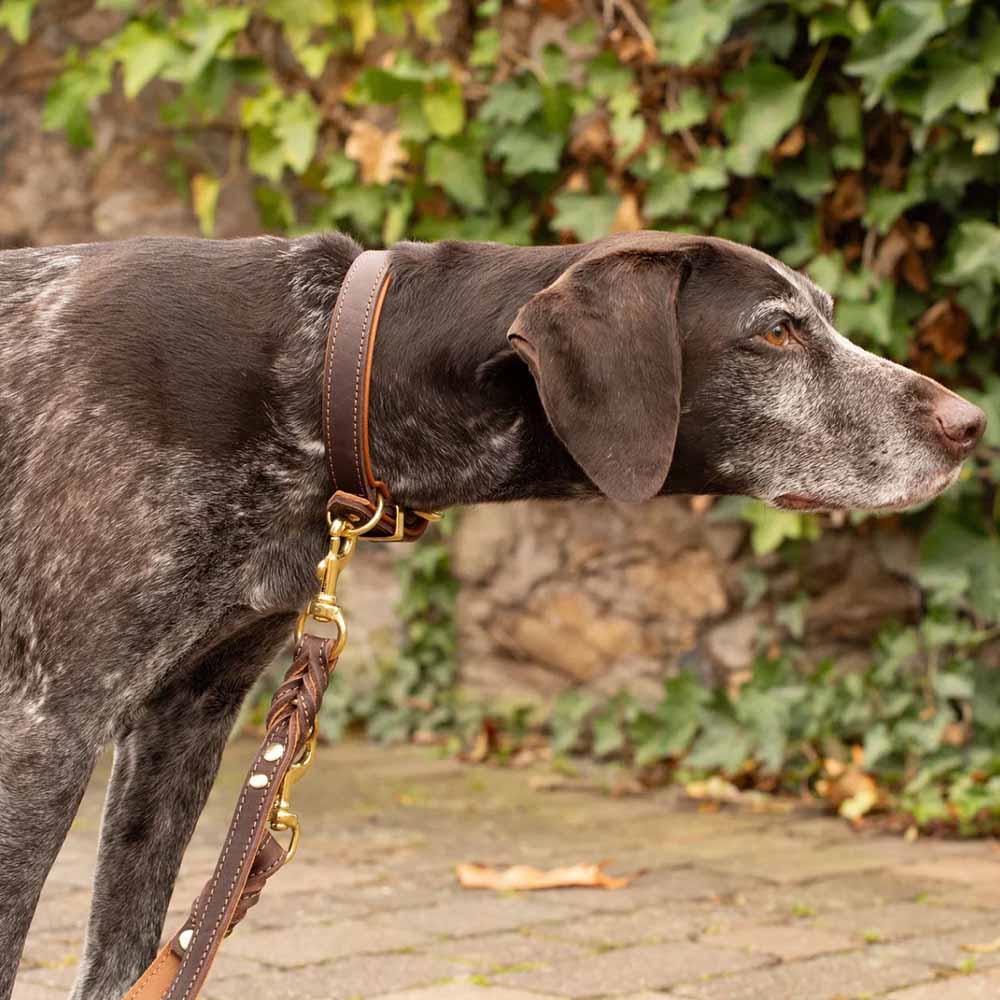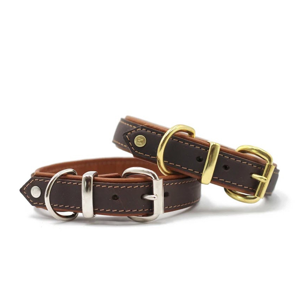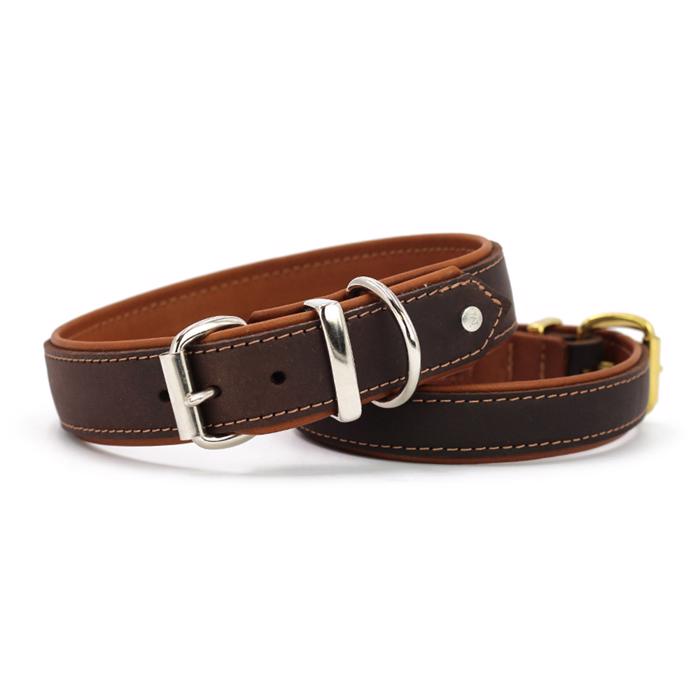 Detta halsband är mörkbrunt utvändigt med cognacfärgat läder invändigt. Spännena och detaljerna är i krom.