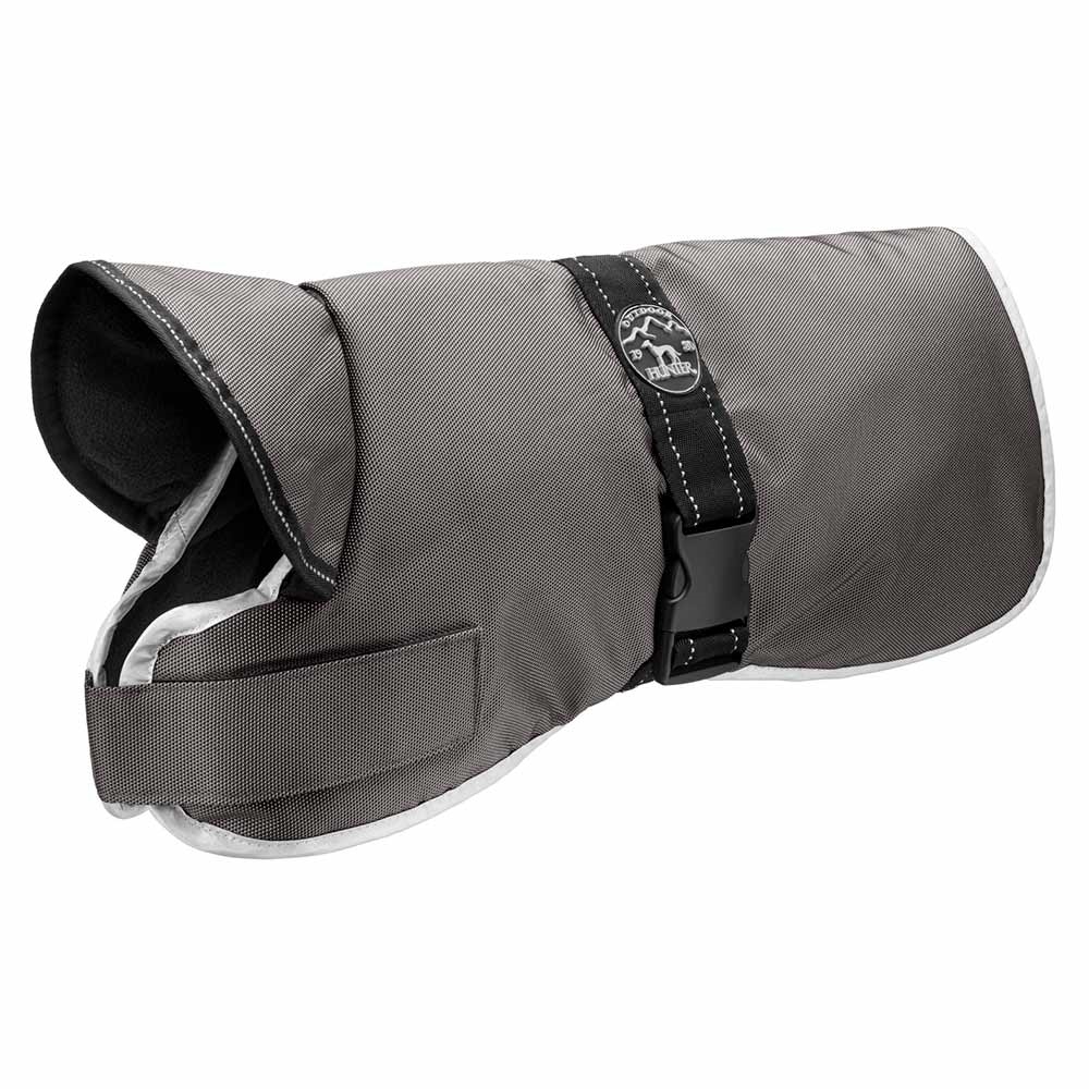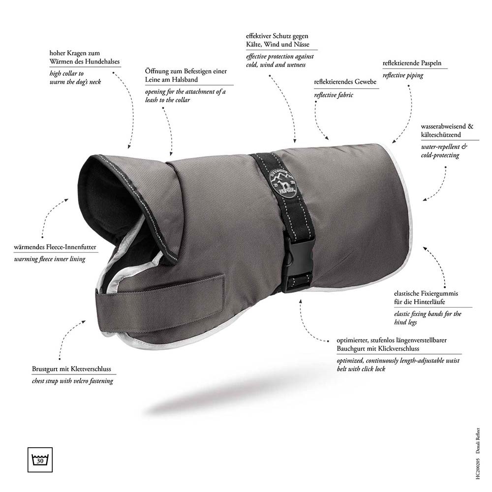 Det härliga invändiga fleecefodret ger extra värme och skön komfort. Den höga kragen som jackan har ger ett effektivt skydd för hundens hals mot kyla utan att begränsa dess rörelsefrihet. Jackan kan anpassas till kroppen med hjälp av en stor kardborrestängning i bröstområdet, och magbältet kan justeras. Väljer man strl. 50 och uppåt, så får jackan 2 magbälten.