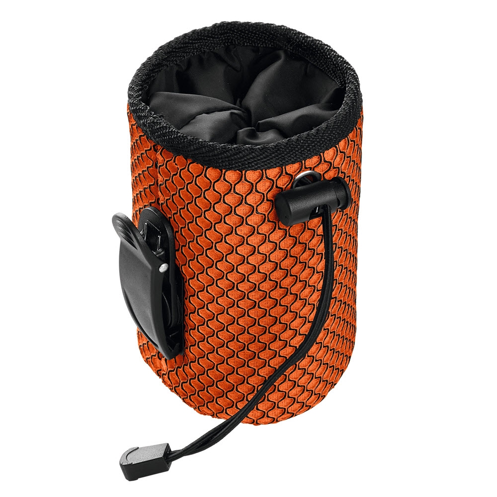 Materialet är mesh polyester som inte tar lukt och inte heller ändrar form. När den står öppen är den styvad på ett bra sätt i toppen så att godsakerna lätt kommer fram. Med ett lätt drag i spännsnöret är det stängt för härligheterna.