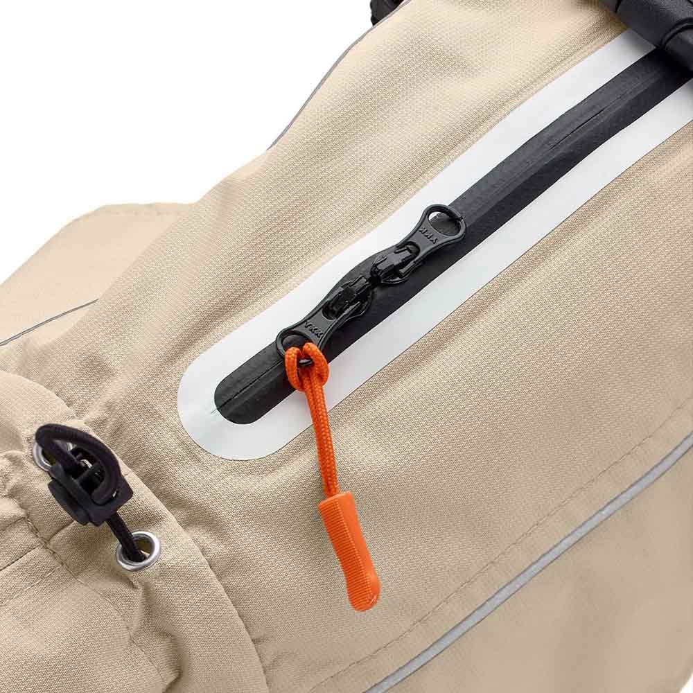 Jackan har öppning för selen med dragkedja och elastiska justerbara bakbensremmar som tydligt säkerställer att jackan sitter på plats under promenaden oavsett väder och vind. Samtidigt kan den justeras i halsen både vid axeln och öronen.