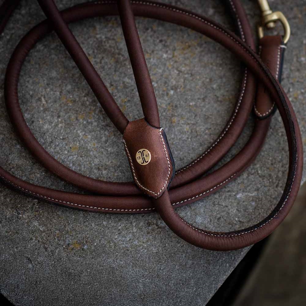 Detta fina bruna läderkoppel ligger lätt och skönt i handen. Kopplet är designat med en snygg karbinhake i mässing och har ett handtag i änden.